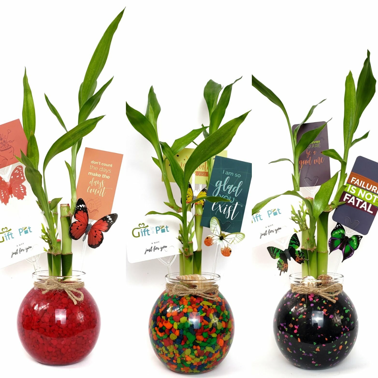 Three stalks lucky bamboo round jar with burlap bow. This beautiful arrangement symbolizes and attracts long life, wealth, and happiness. Comes with a care guide, two motivational cards, and two butterflies.