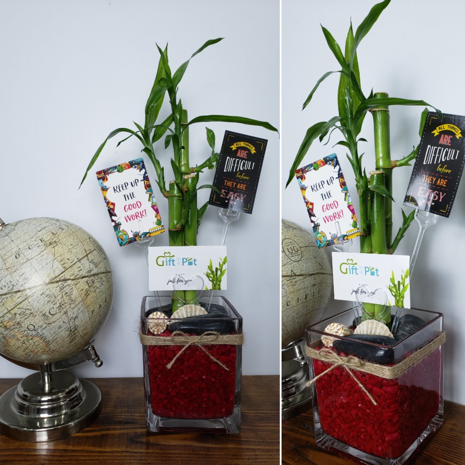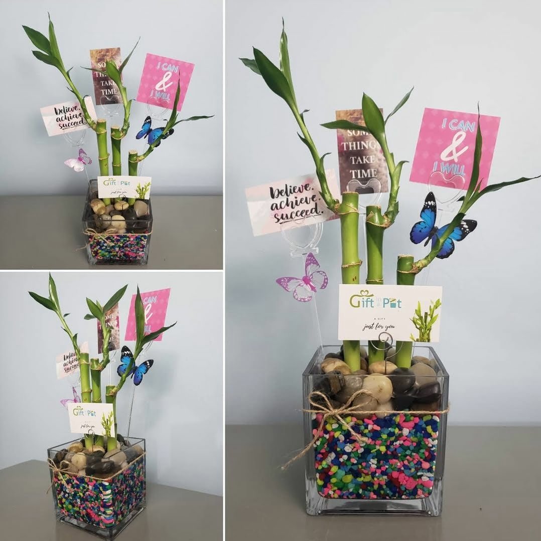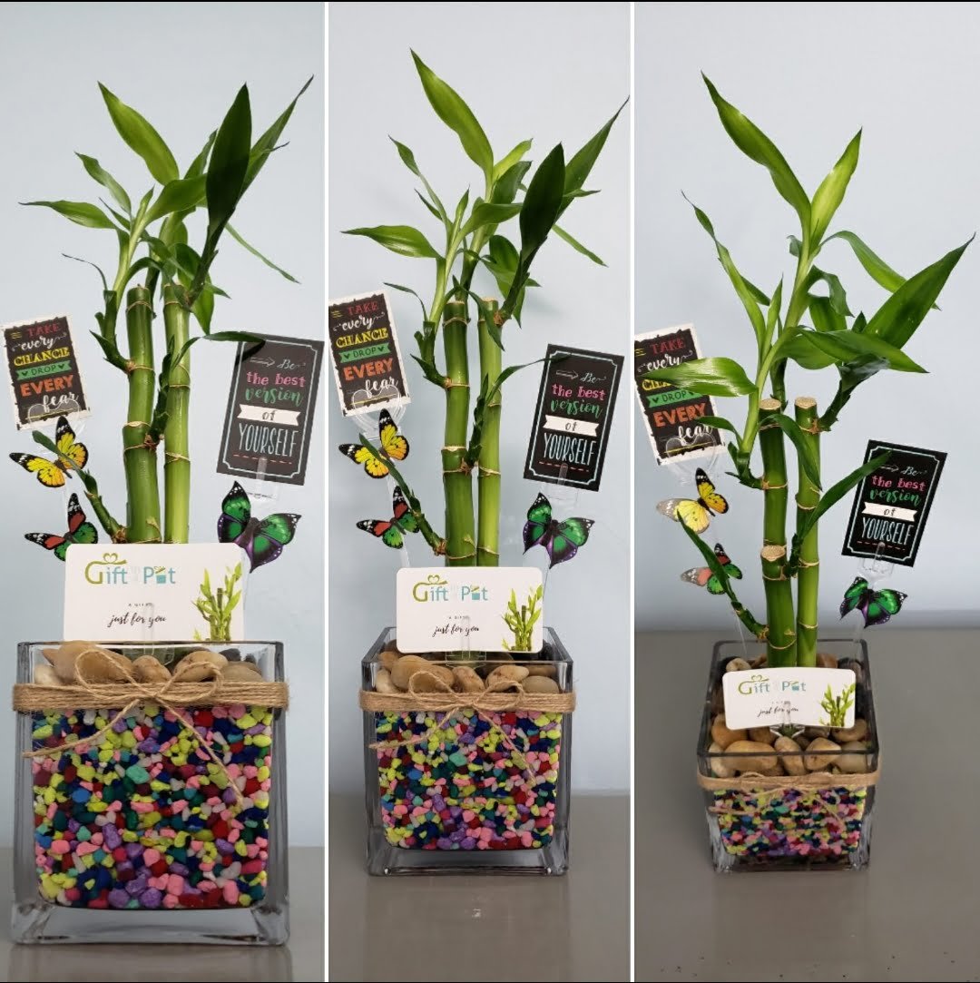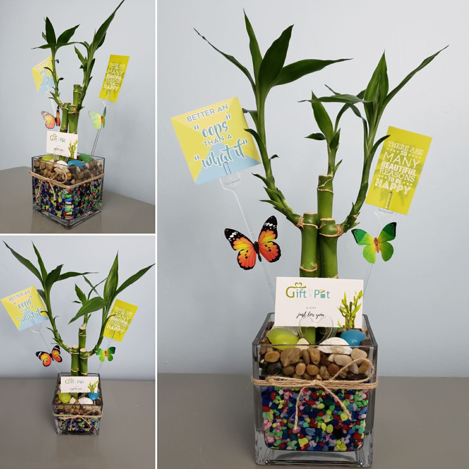 Three stalks lucky bamboo large square jar with burlap bow. This beautiful arrangement symbolizes and attracts long life, wealth, and happiness. Comes with a care guide, two motivational cards, and two butterflies.