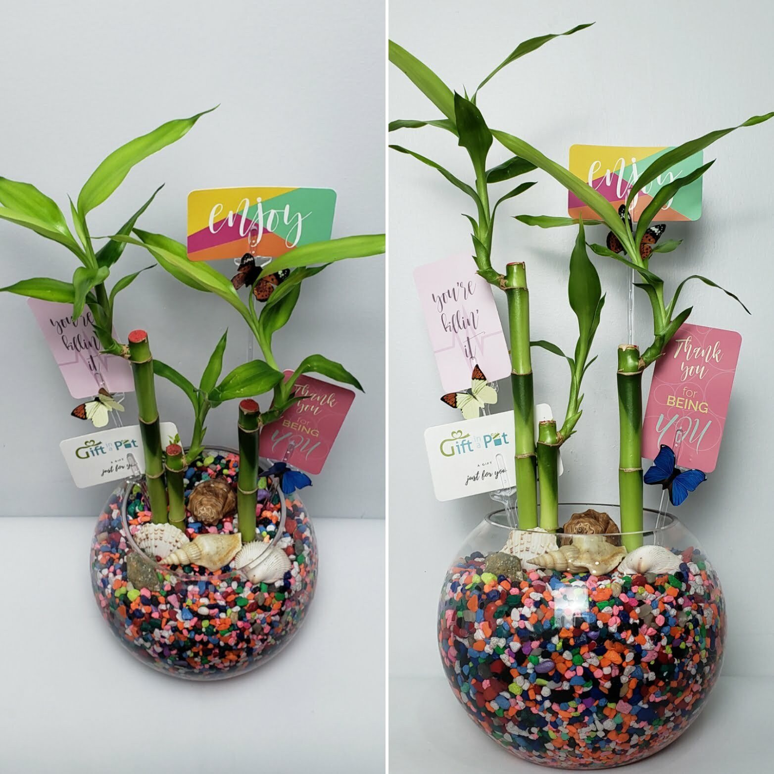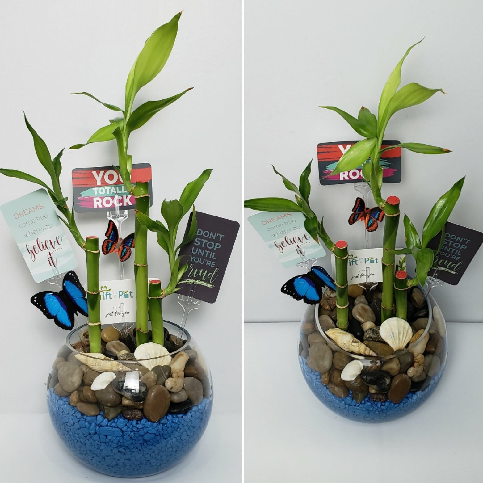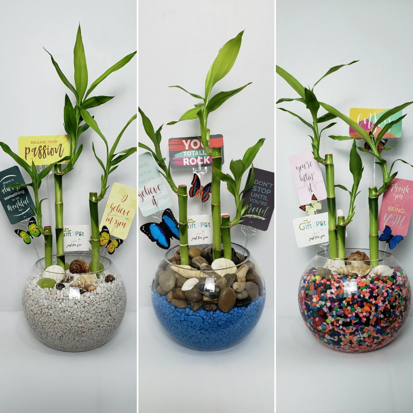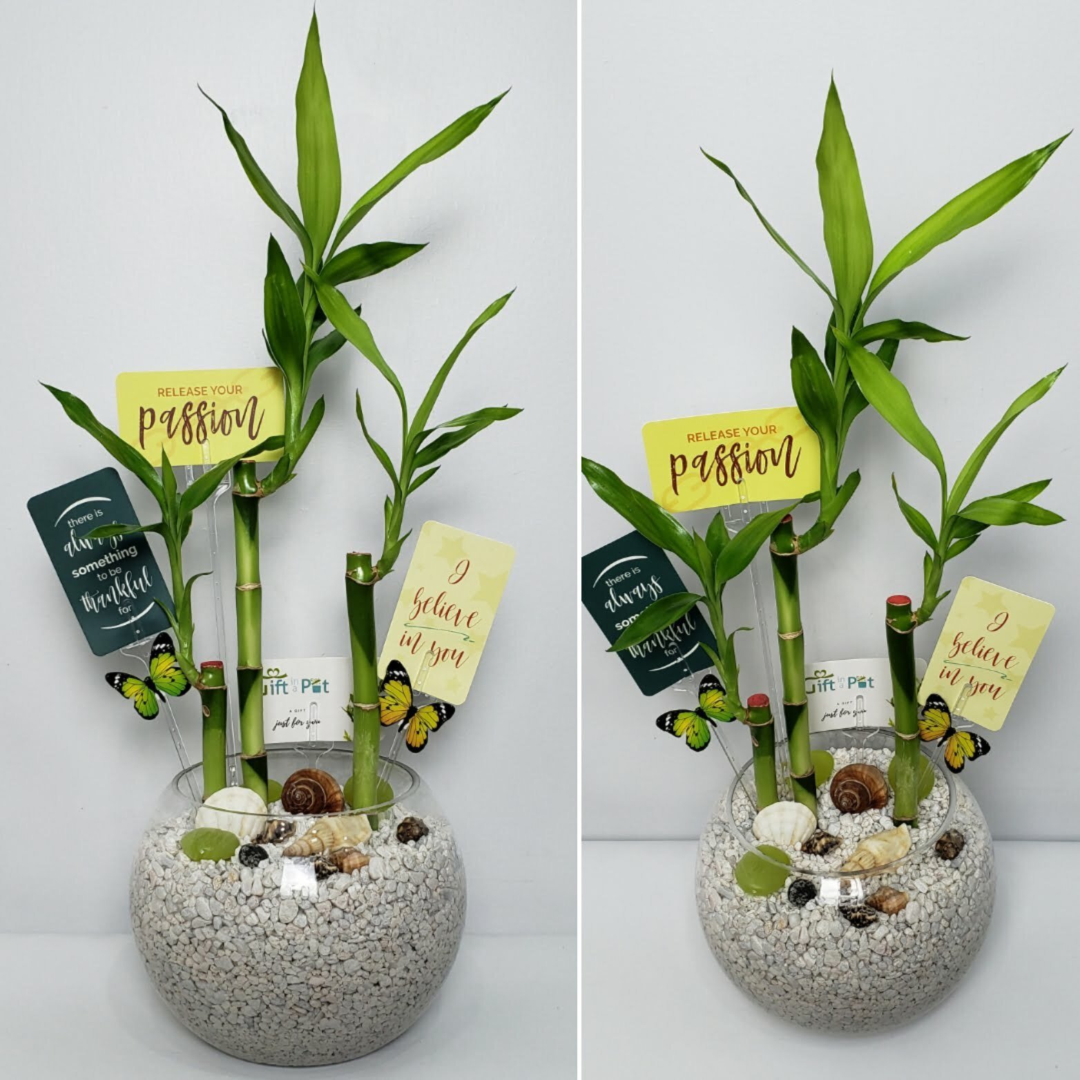 Three stalks lucky bamboo Fish Bowl. This beautiful arrangement symbolizes and attracts long life, wealth, and happiness. Comes with a care guide, three motivational cards, and two butterflies.